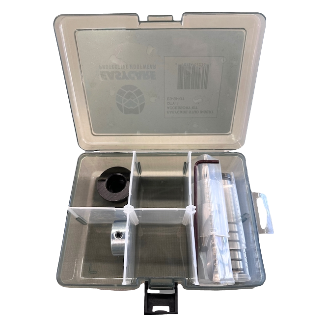 Monteringssett til EasyCare stud insert (broddinnsats) for montering av brodder. Dette settet er et must om man skal brodde EasyShoe sine limsko selv. Medfølgende forsenkingsbor og hullslag gjør at man kan montere bordder uten at man få press på sålen fra innsatsen og brodden.